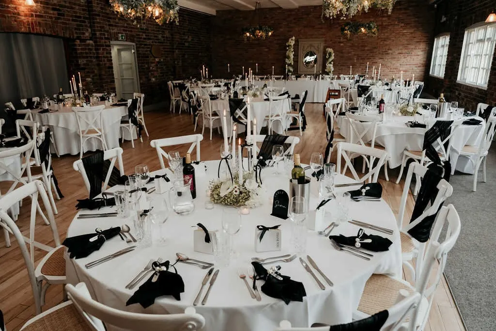 When the doors opened later in the afternoon, guests were invited to take their seats. The space was set with a long top table for the newlyweds and round tables for their guests, all dressed with white linens. Hope and Craig had chosen to provide their own centrepieces, adding personal touches that reflected their style and vision for the celebration.