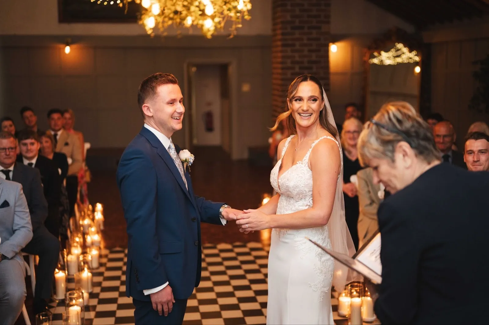 Guests were welcomed through the side entrance into the bar and lounge, where drinks were flowing and the atmosphere was already warm and sociable. As we prepared to begin the ceremony, we guided guests through to the ceremony room, where the space had been softly styled with candlelight from our Lit With Love package and delicate fairy lights for the aisle provided by Hipswing.