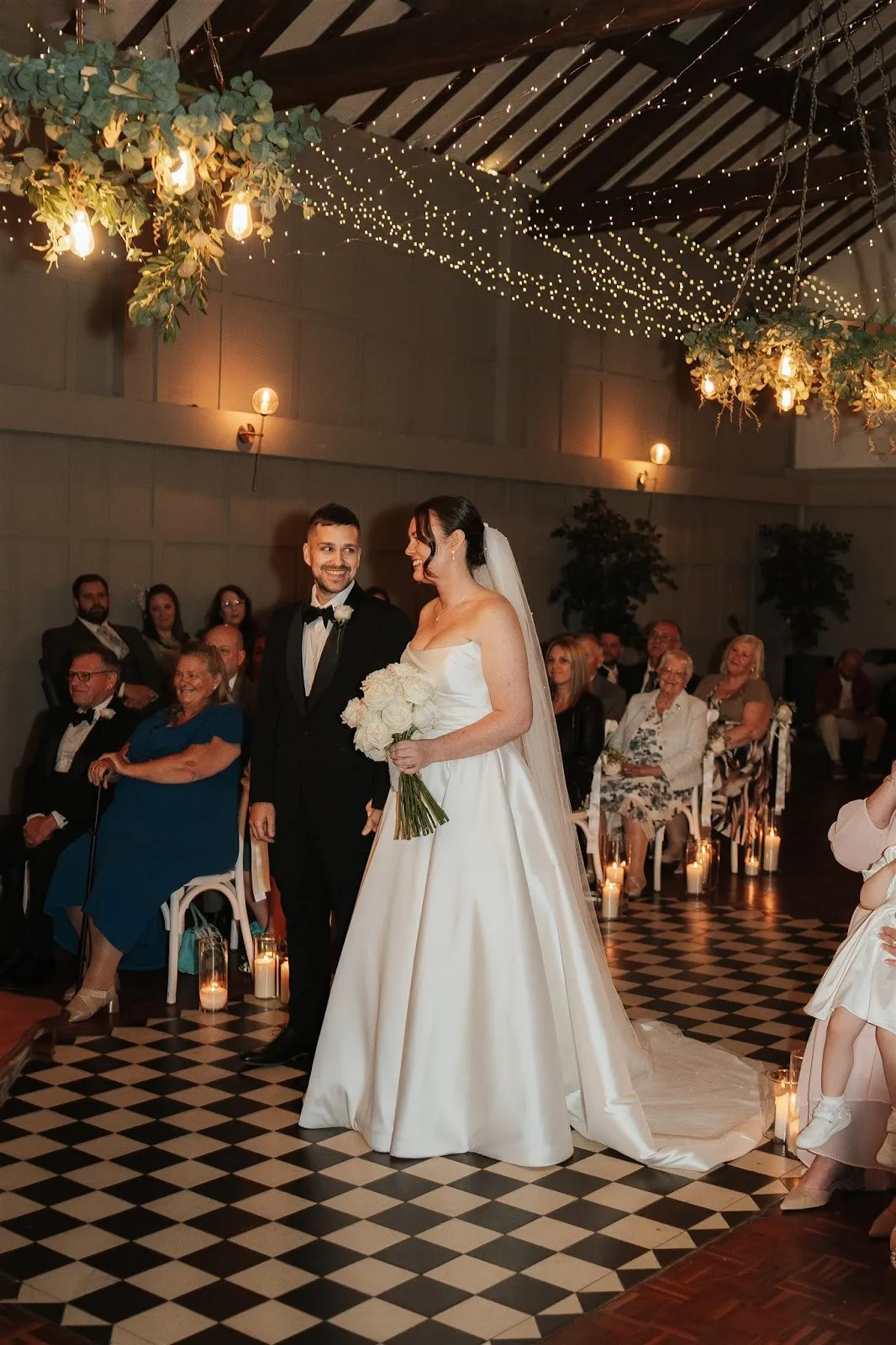 When it was time for the ceremony, guests were welcomed into our atmospheric Ceremony Room, which is one of the most unique spaces in our Cheshire wedding venue. When couples come to view our venue, the room’s monochrome floor tiles, retro theatre seating, and twinkling lights set high among the oak trusses are what draw a lot of them in initially - and we couldn’t agree more!