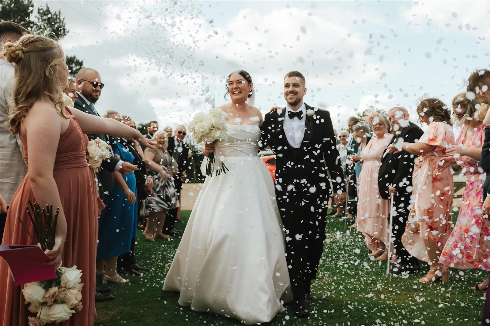 After the ceremony, everyone gathered outside for one of our favourite moments of any wedding day, the confetti shot! This is always such a joyful moment, and Stephanie and Aaron’s was no exception. Their guests showered them with soft white confetti as they made their way through the lawn, creating a beautifully elegant scene filled with smiles and laughter.
