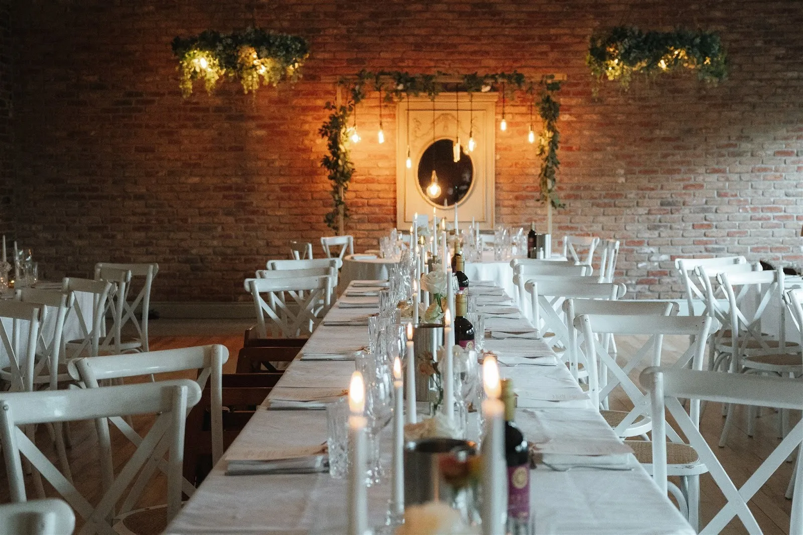 Dozens of white taper candles glowed softly across all the long tables, filling the space with warm ambient light. Overhead, our lighting adorned with greenery created a stunning effect that made the entire room feel like an intimate, inviting space.